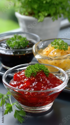 Close-up of assorted homemade colorful fruit jams in glass bowls garnished with parsley sprigs, displayed on a tray.
