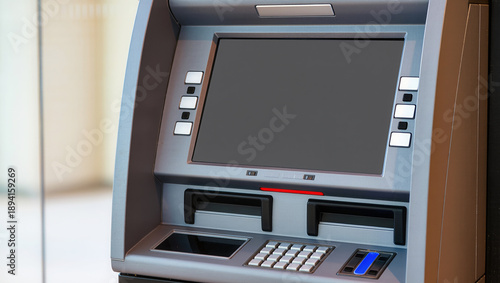 Close-up of ATM in shopping mall, metal casing, screen, side buttons, keypad, card slot with blue indicator, cash dispensers, illustrating cash withdrawal and shopping center access