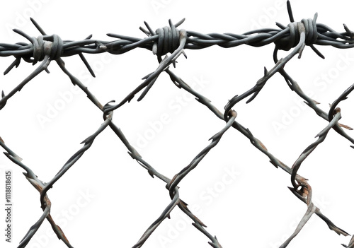 Close-up of barbed wire fence on transparent background, security and protection concept
