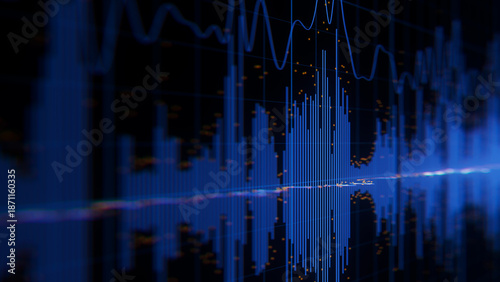 Closeup of Big Data sound complex graph background with shallow DOF. Cyber space of Audio AI technology. Futuristic graph. Digital audio information presentation.