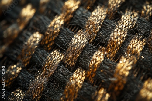 Close-up of black fabric interwoven with gold threads, luxurious texture.