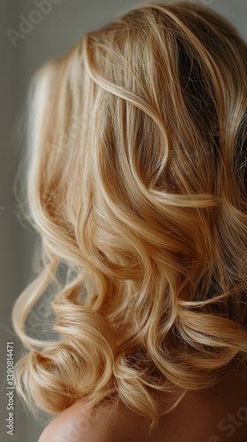 Close-up of blond hair, wavy texture, showing strands and shine, showcasing healthy and luxurious hair, ideal for beauty or haircare concepts
