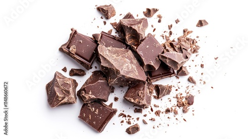 Close-up of broken dark chocolate pieces isolated on white.