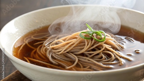 Close-up of buckwheat soba noodles floating on the surface of the steaming hot broth, ingredient, bowl, liquid, texture, comfort
