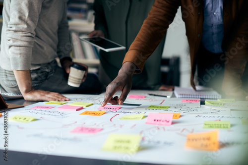 Close-up of business team brainstorming while working on mind map in the office.