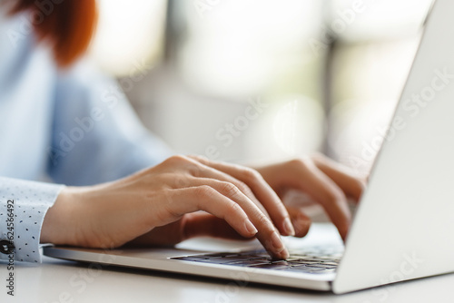 Closeup of business woman hands typing on keyboard, working online in modern office. Programmer, coder using laptop computer at workplace Remote job concept. Technology concept
