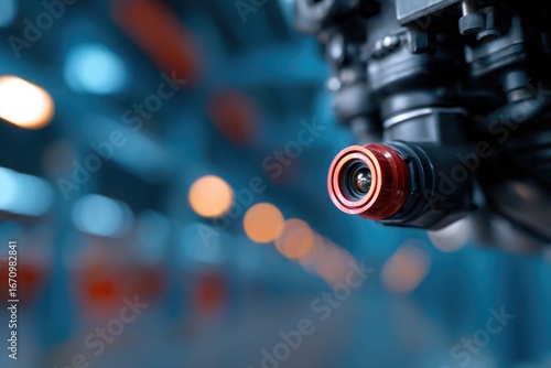Close-up of camera lens capturing vibrant industrial setting wit