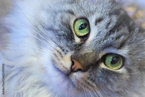 Closeup of cat face with green eyes.