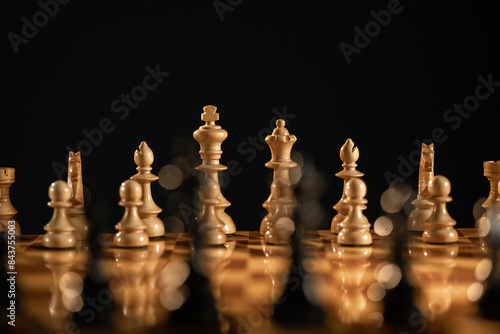 Close-up of chess pieces arranged on a wooden board. Business strategy and planning