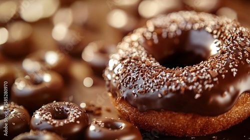 Closeup of chocolate glazed donuts with nuts on bakery tray for dessert sweet food pastry indulgence product photography