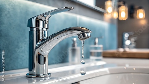 Close-Up of Chrome Faucet with Water Droplets in Modern Bathroom