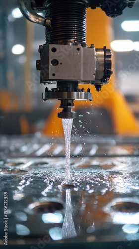 Close-up of CNC water jet machine cutting metal, showcasing precision engineering industrial manufacturing and high-tech metal fabrication for automotive and machinery parts.