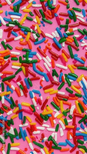 Close-up of colorful candy sprinkles scattered on a bright pink background, vibrant and festive sweet decoration
