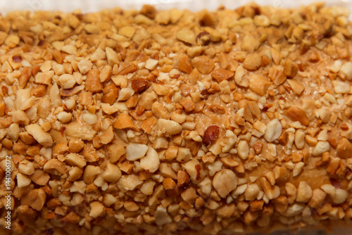 Close-up of crushed peanut-covered dessert surface texture in warm lighting