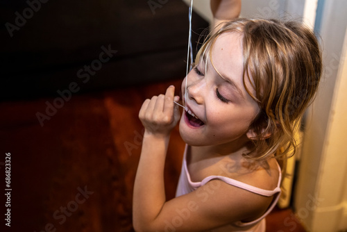 Close-up of cute girl using dental floss in bathroom at home