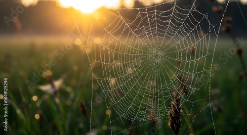 Close-up of dew-covered spiderweb in soft morning light