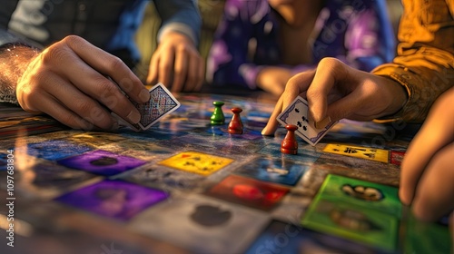Close-up of diverse hands playing a colorful board game, capturing the excitement and interaction during gameplay.