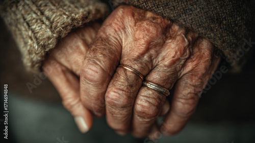 close-up of elderly couple holding hands with wrinkled skin and wedding rings, symbol of love, care, marriage, togetherness and emotional family connection concept