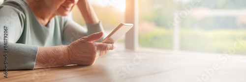 Close-up of elderly woman learning to use a smartphone in the kitchen, focusing on her hand and soft lighting, digital literacy, learning. copy space.