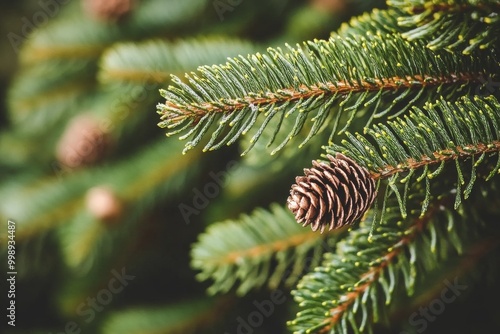 Close-up of evergreen tree branches with delicate pine cones, illuminated by soft natural light, capturing the beauty of nature during the winter holiday season.