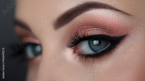 Close-up of Eye Makeup: Captivating close-up showcasing a woman's eye enhanced by expertly applied makeup, featuring a dramatic winged eyeliner, soft peach eyeshadow, and defined eyebrows.