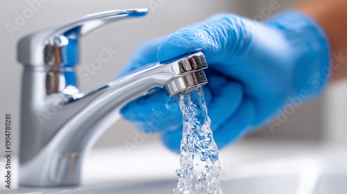 Close-up of faceless hands in new blue gloves testing the water pressure of a newly installed faucet, Plumbing Inspection, focus on the crystal clear water stream and the chrome fi