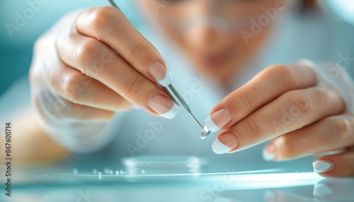Close-up of Female Hands Holding Tweezers and Placing a Small Object on a Glass Surface