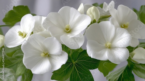 Close-up of five pristine white flowers with green leaves, subtly blurred background.