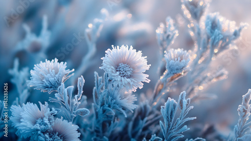 Close-up of flowers covered in frost or ice crystals in a cold, winter landscape