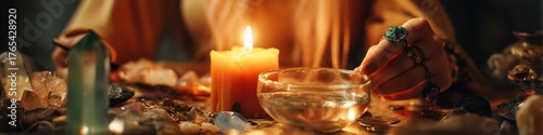 Close-up of fortune teller's hand over a scrying bowl with a candle