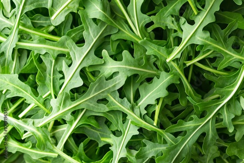 Close-up of fresh arugula leaves with vibrant green color and distinct leaf shape. Ideal for themes related to healthy eating, organic produce, and culinary ingredients.