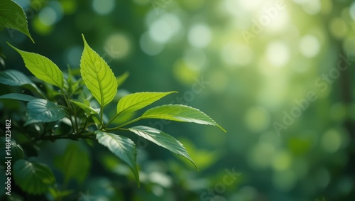 Closeup of Fresh Green Leaves Glowing in Soft Morning Light with Bokeh Background in Nature