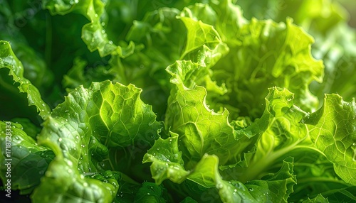 Closeup of Fresh Green Lettuce Leaves with Vibrant Texture and Sunlight Glistening on Surface in Outdoor Setting with Lush Foliage