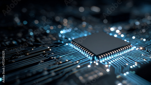 Close-up of futuristic microchip with glowing circuits