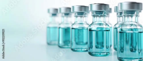 Close-up of glass vaccine vials filled with blue liquid, arranged in a row. Ideal for medical and health-related visuals.
