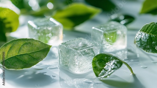 Close-up of glistening ice cubes nestled amongst vibrant green leaves, showcasing refreshing coolness and natural elements.