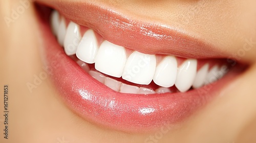 Close-up of glossy lips and perfect white teeth in radiant smile, symbolizing dental health, oral hygiene, beauty wellness, and confident lifestyle