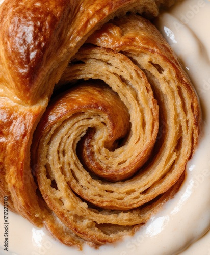 Close-up of golden, flaky croissant layers with creamy sauce