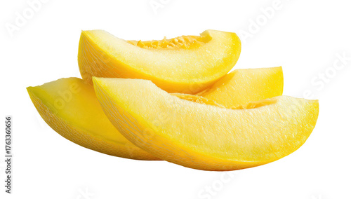 Close-up of golden melon slices, layered and vibrant, isolated against a black background