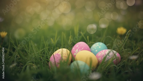 Close-up of grass with hidden easter eggs, seasonal celebration imagery