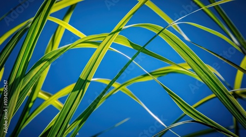 Close-up of green and yellow grass blades against a vibrant blue sky.
