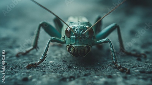 Close-Up of Green Grasshopper's Face, Macro Photography with Copy Space, AI generated illustration
