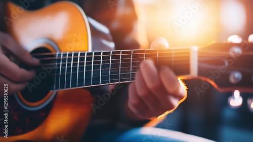 Close-up of Guitarist Strumming an Acoustic Guitar in a Warm and Inviting Atmosphere : Generative AI