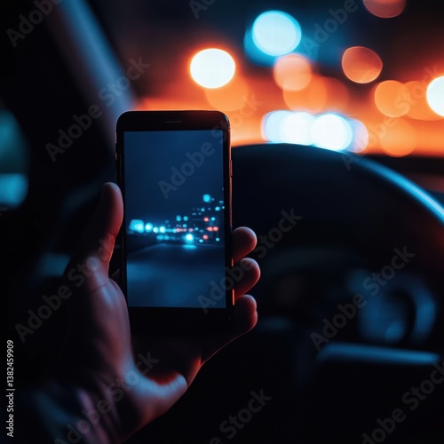 Closeup of hand holding smartphone with white mockup on screen,black mobile phone in hands with blank desktop screen while car driving,Mockup image,Copyspace for text.