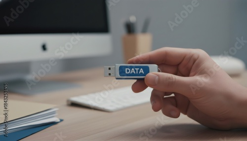 Close-up of Hand Holding USB Flash Drive Labeled 'DATA' at Office Desk