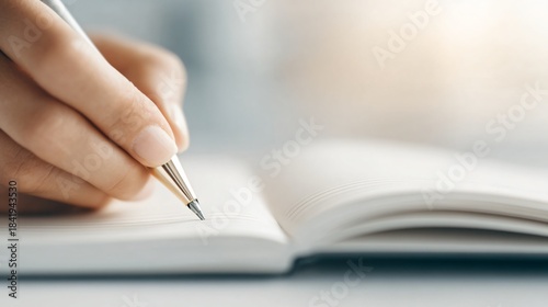 Close-up of hand writing new goals on journal, natural lighting, personal growth theme