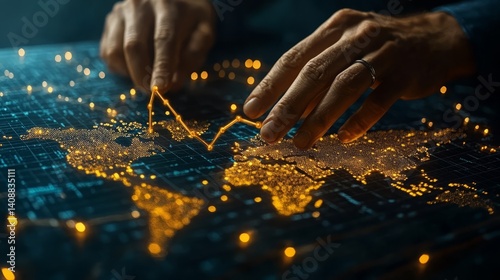 Close-up of hands analyzing a financial chart with a pen, highlighting fluctuating stock market data over a digital interface