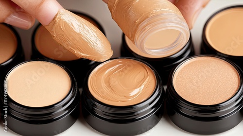 Close-up of hands applying creamy foundation from a container onto small sample pots.