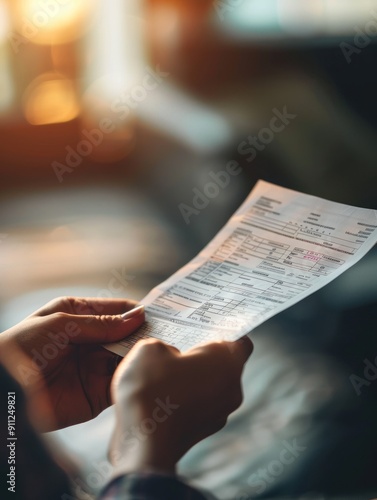 Closeup of Hands Holding a Bill with a Blurry Background.