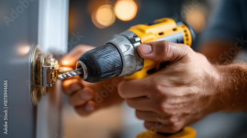 Close-up of hands operating cordless power drill on door hardware mechanism, locksmith service, security installation, home maintenance, DIY repair project, metallic components, sh